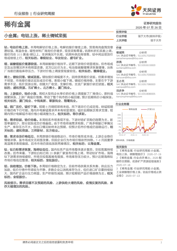 【天风证券】【20200726】20200726-天风证券-稀有金属行业研究周报:小金属:电钴上涨,稀土镝铽坚挺-16页