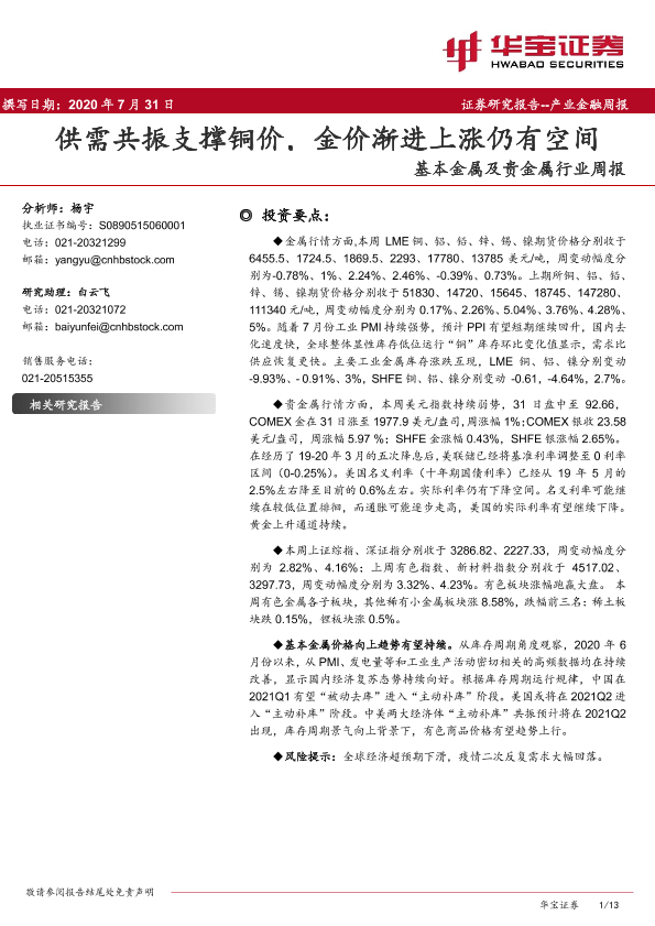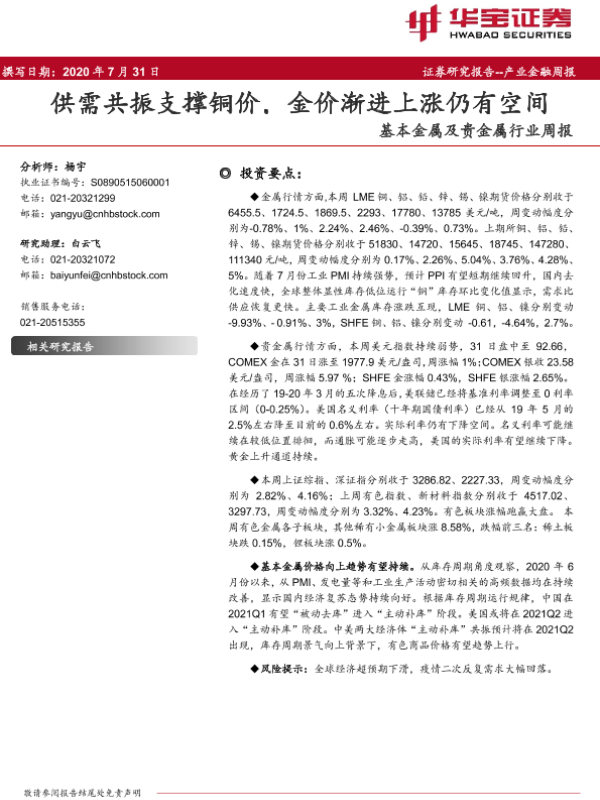 【华宝证券】【20200731】20200731-华宝证券-基本金属及贵金属行业周报:供需共振支撑铜价,金价渐进上涨仍有空间-13页