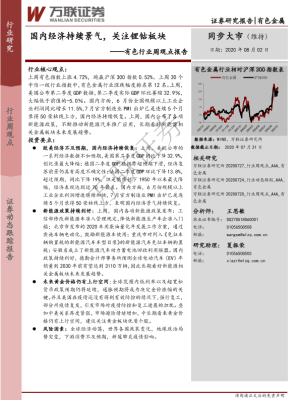 【万联证券】【20200802】20200802-万联证券-有色行业周观点报告:国内经济持续景气,关注锂钴板块-15页