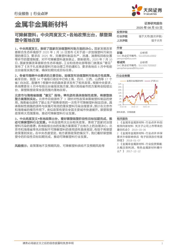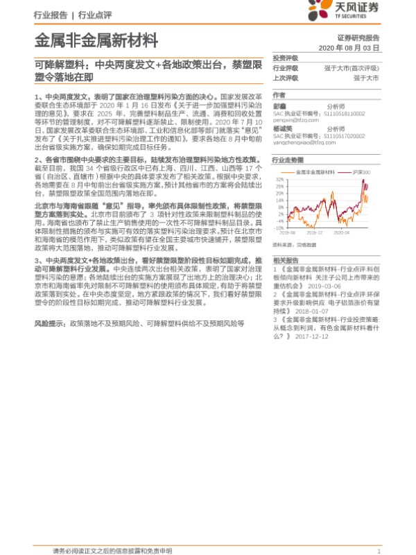 【天风证券】【20200803】金属非金属新材料行业点评:可降解塑料:中央两度发文+各地政策出台,禁塑限塑令落地在即-9页