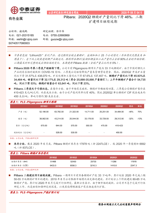 【中泰证券】【20200804】有色金属:Pilbara:2020Q2锂精矿产量同比下滑46%,二期扩建项目继续延期-5页
