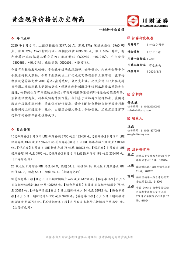 【川财证券】【20200805】材料行业日报:黄金现货价格创历史新高-3页