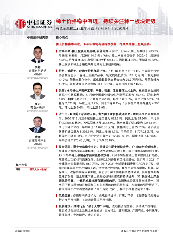 【中信证券】【20200804】20200804-中信证券-有色金属稀土行业半月谈(7月下):稀土价格稳中有进,持续关注稀土板块走势-32页