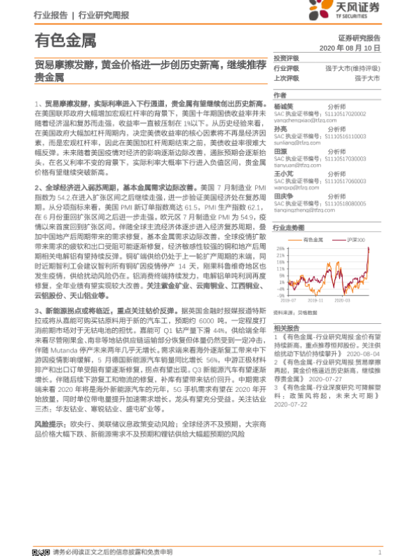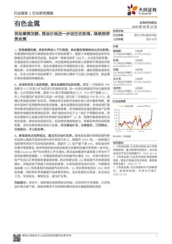 【天风证券】【20200810】20200810-天风证券-有色金属行业研究周报:贸易摩擦发酵,黄金价格进一步创历史新高,继续推荐贵金属-18页