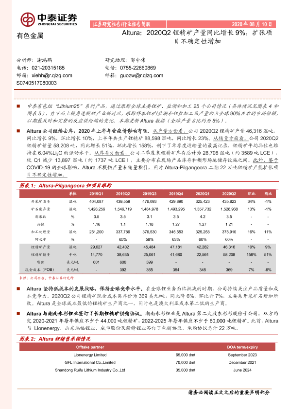 【中泰证券】【20200810】有色金属:Altura:2020Q2锂精矿产量同比增长9%,扩张项目不确定性增加-5页