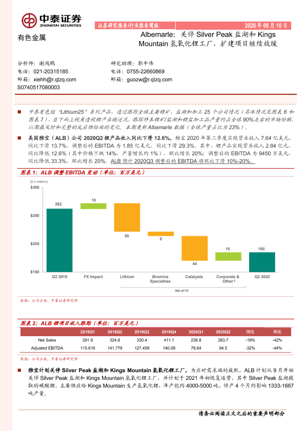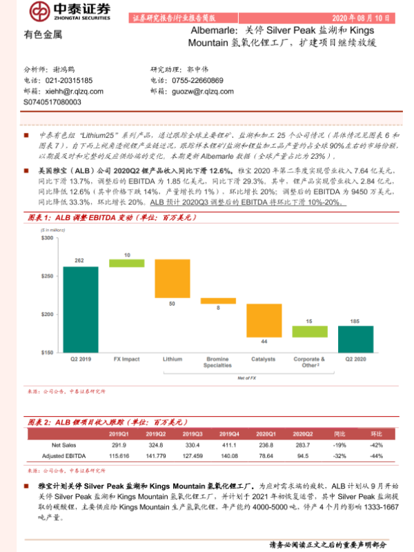 【中泰证券】【20200810】有色金属:Albemarle:关停Silver Peak盐湖和Kings Mountain氢氧化锂工厂,扩建项目继续放缓-5页