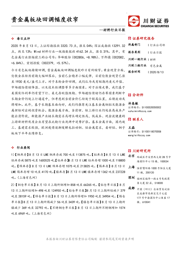 【川财证券】【20200813】材料行业日报:贵金属板块回调幅度收窄-3页