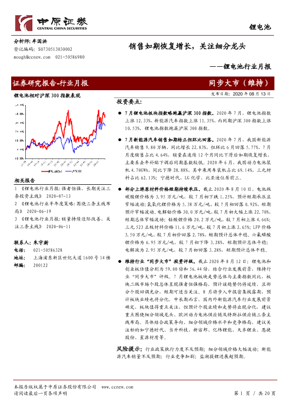 【中原证券】【20200813】20200813-中原证券-锂电池行业月报:销售如期恢复增长,关注细分龙头-20页