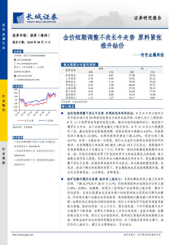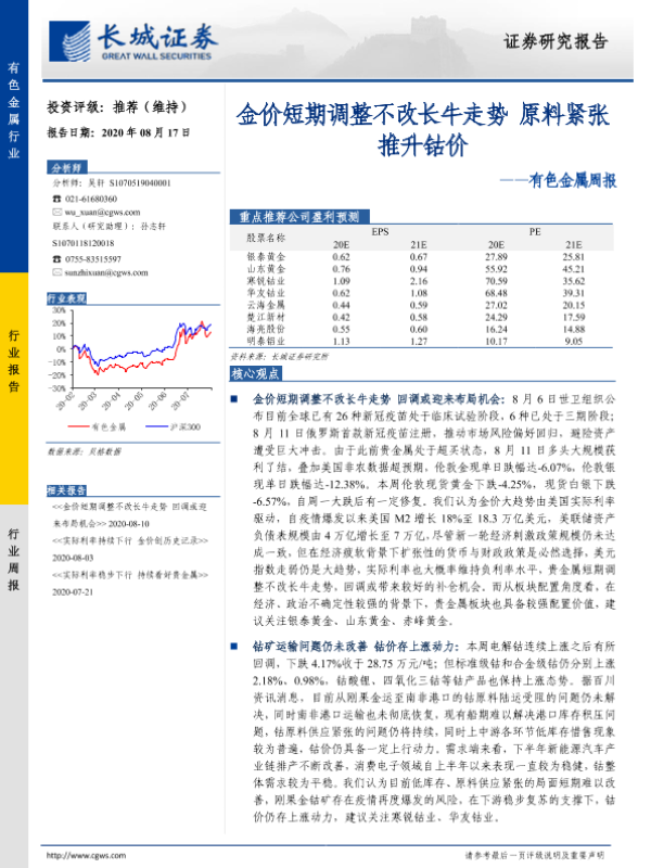【长城证券】【20200817】20200817-长城证券-有色金属周报:金价短期调整不改长牛走势 原料紧张推升钴价-12页