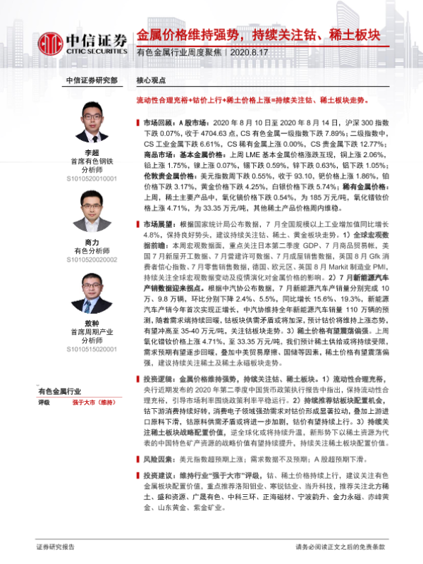 【中信证券】【20200817】20200817-中信证券-有色金属行业周度聚焦:金属价格维持强势,持续关注钴、稀土板块-18页