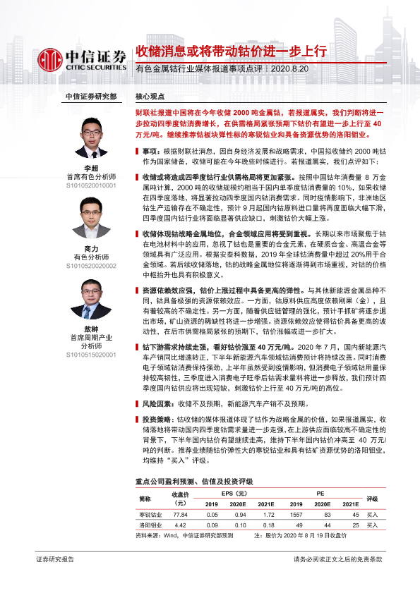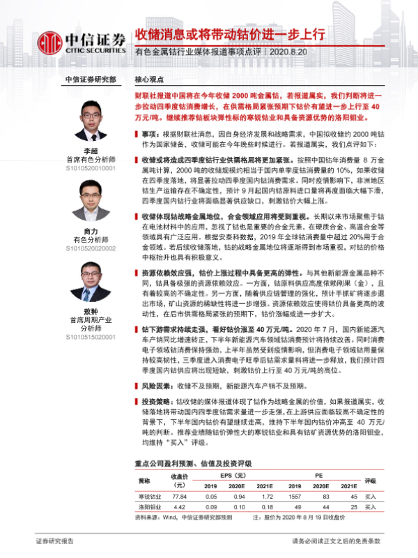 【中信证券】【20200820】20200820-中信证券-有色金属钴行业媒体报道事项点评:收储消息或将带动钴价进一步上行-3页