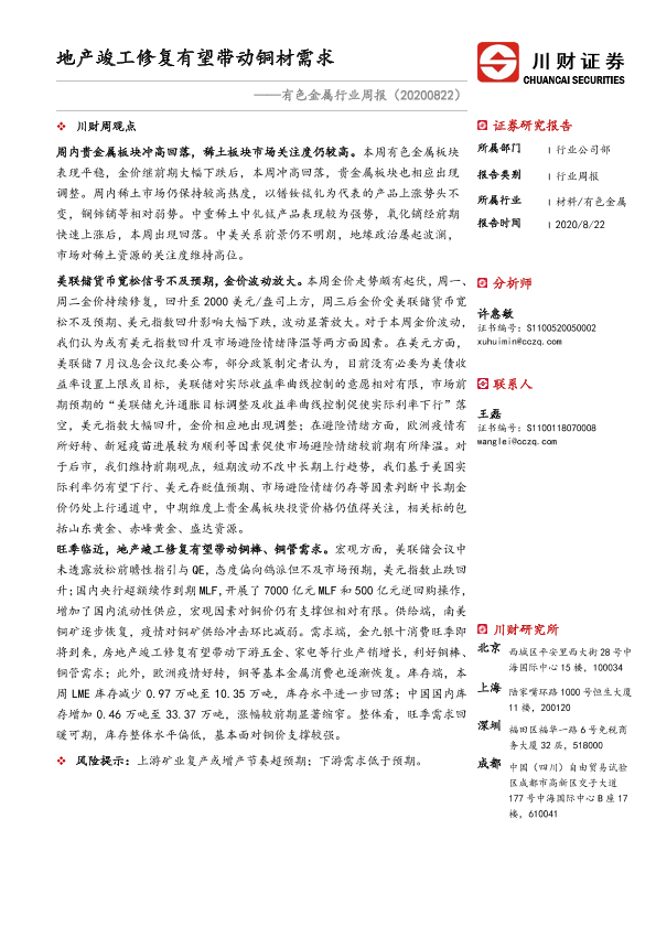 【川财证券】【20200822】有色金属行业周报:地产竣工修复有望带动铜材需求-12页