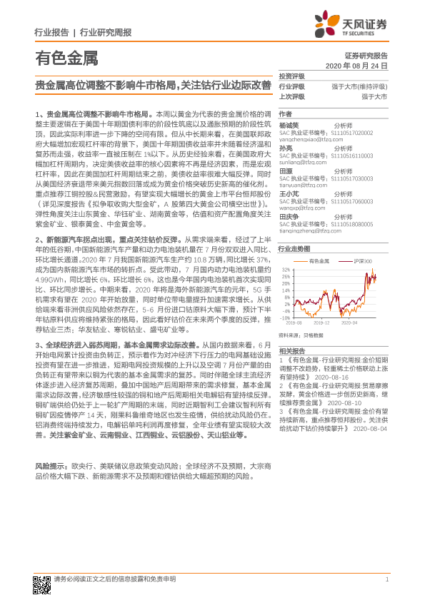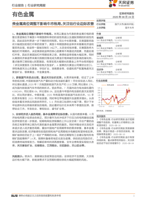 【天风证券】【20200824】20200824-天风证券-有色金属行业研究周报:贵金属高位调整不影响牛市格局,关注钴行业边际改善-14页