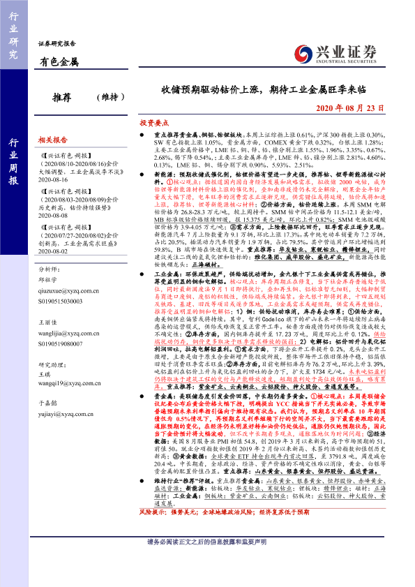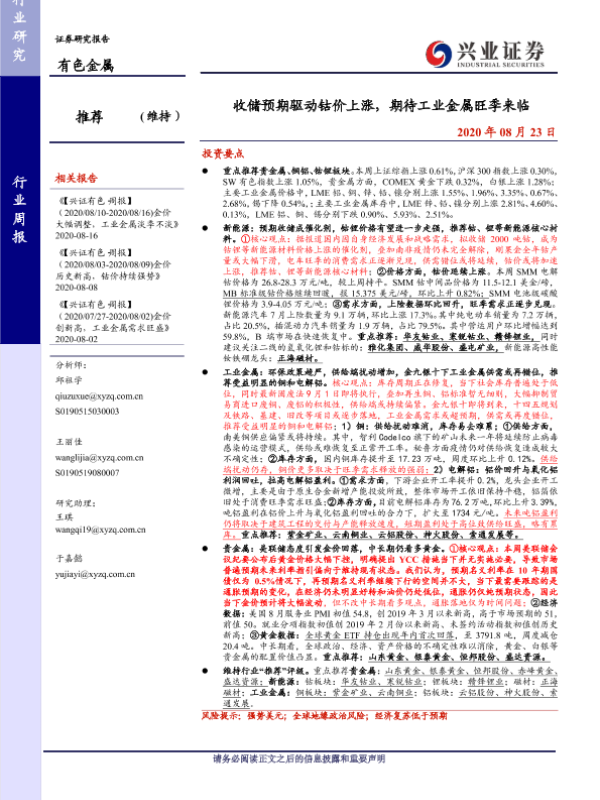 【兴业证券】【20200823】20200823-兴业证券-有色金属行业周报:收储预期驱动钴价上涨,期待工业金属旺季来临-22页