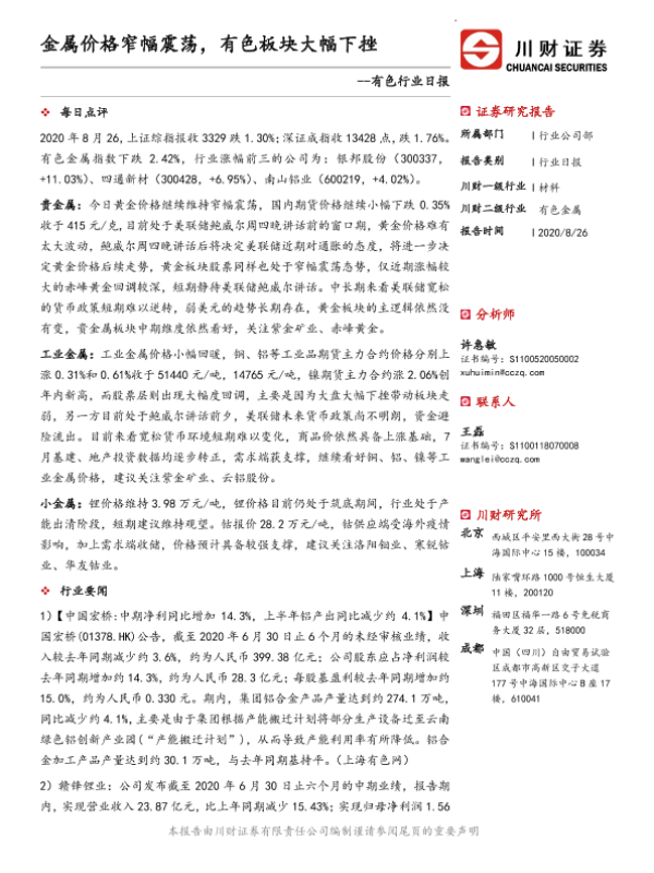 【川财证券】【20200826】有色行业日报:金属价格窄幅震荡,有色板块大幅下挫-3页