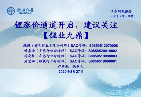 【海通证券】【20200827】20200827-海通证券-有色金属行业报告:锂涨价通道开启,建议关注【锂业九鼎】-17页
