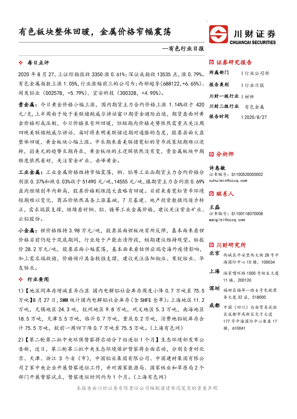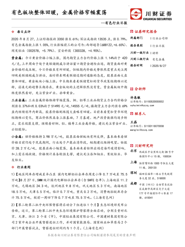 【川财证券】【20200827】有色行业日报:有色板块整体回暖,金属价格窄幅震荡-3页