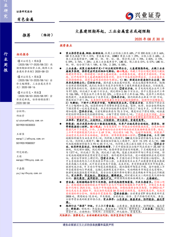 【兴业证券】【20200830】20200830-兴业证券-有色金属行业周报:大基建预期再起,工业金属需求或超预期-21页