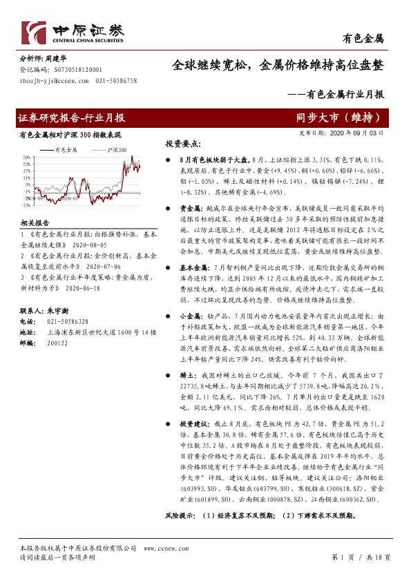 【中原证券】【20200903】20200903-中原证券-有色金属行业月报:全球继续宽松,金属价格维持高位盘整-18页
