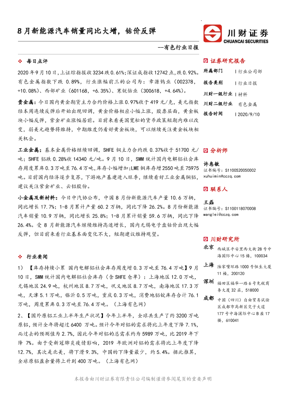 【川财证券】【20200910】8月新能源汽车销量同比大增,钴价反弹-3页