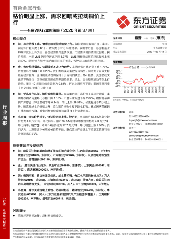【东方证券】【20200914】有色钢铁行业周策略(2020年第37周):钴价明显上涨,需求回暖或拉动铜价上行-25页