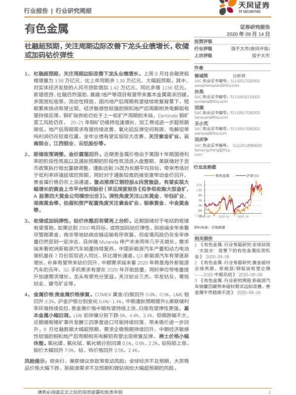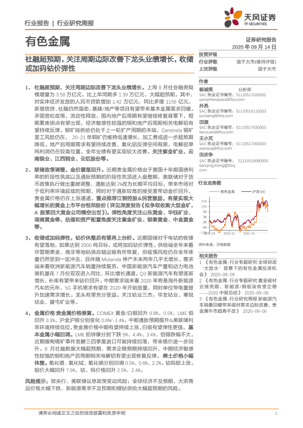 【天风证券】【20200914】20200914-天风证券-有色金属行业研究周报:社融超预期,关注周期边际改善下龙头业绩增长,收储或加码钴价弹性-14页