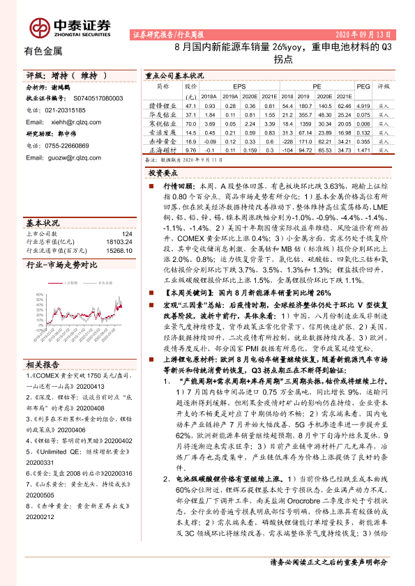 【中泰证券】【20200913】20200913-中泰证券-有色金属行业周报:8月国内新能源车销量26%yoy,重申电池材料的Q3拐点-40页