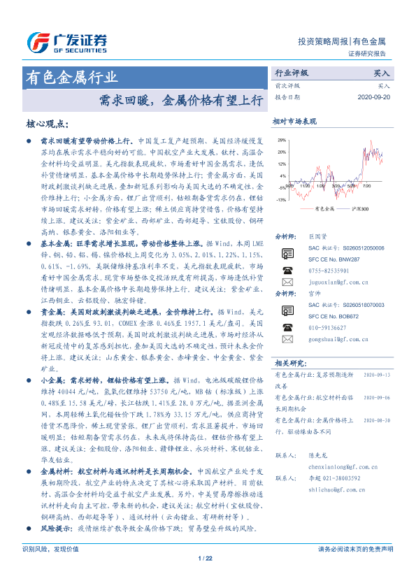 【广发证券】【20200920】20200920-广发证券-有色金属行业投资策略周报:需求回暖,金属价格有望上行-22页