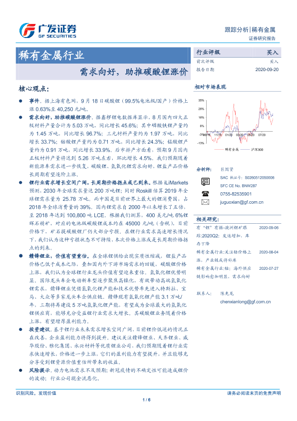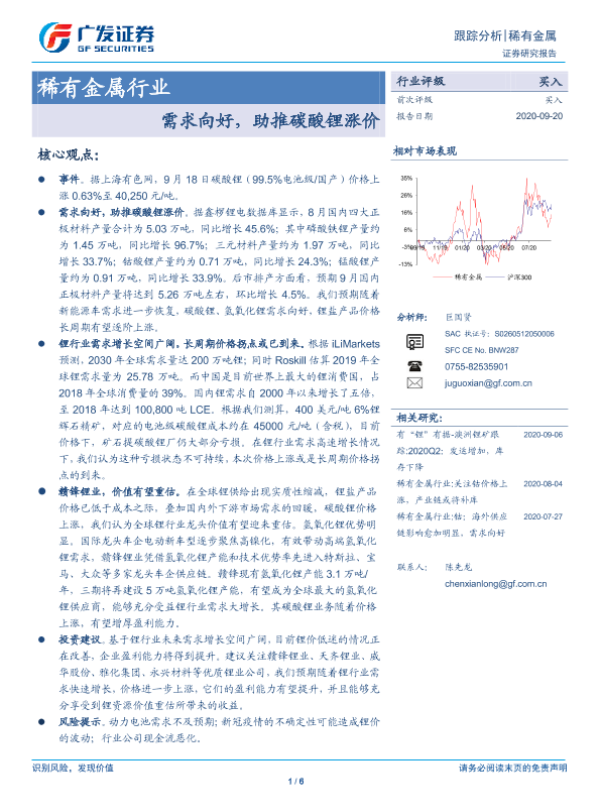 【广发证券】【20200920】稀有金属行业:需求向好,助推碳酸锂涨价-6页