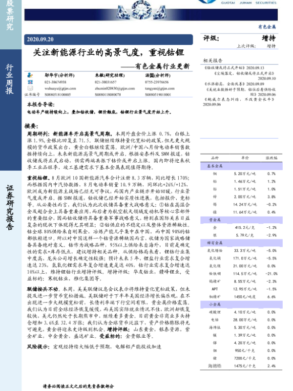 【国泰君安证券】【20200920】20200920-国泰君安-有色金属行业更新:关注新能源行业的高景气度,重视钴锂-12页