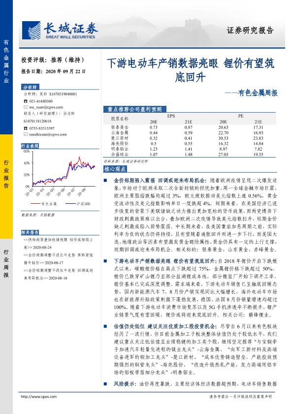 【长城证券】【20200922】20200922-长城证券-有色金属周报:下游电动车产销数据亮眼 锂价有望筑底回升-12页