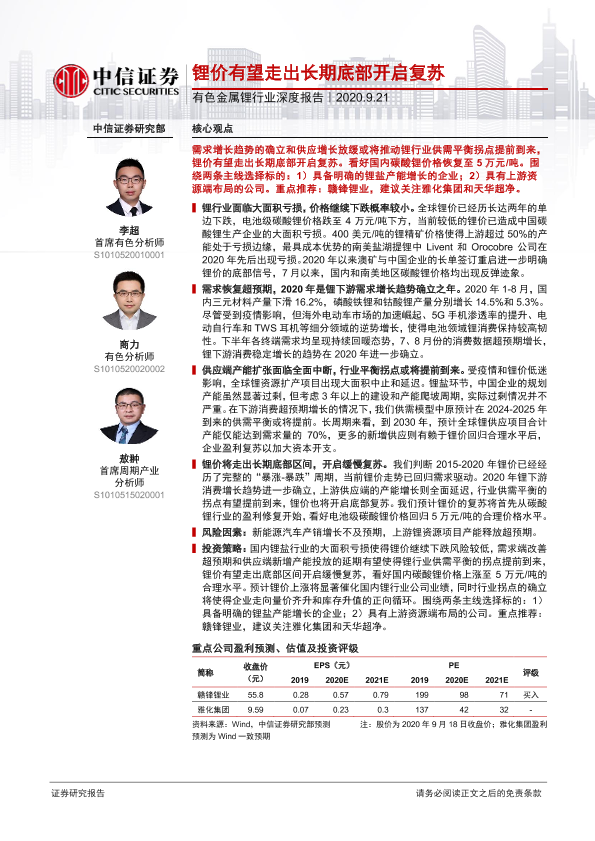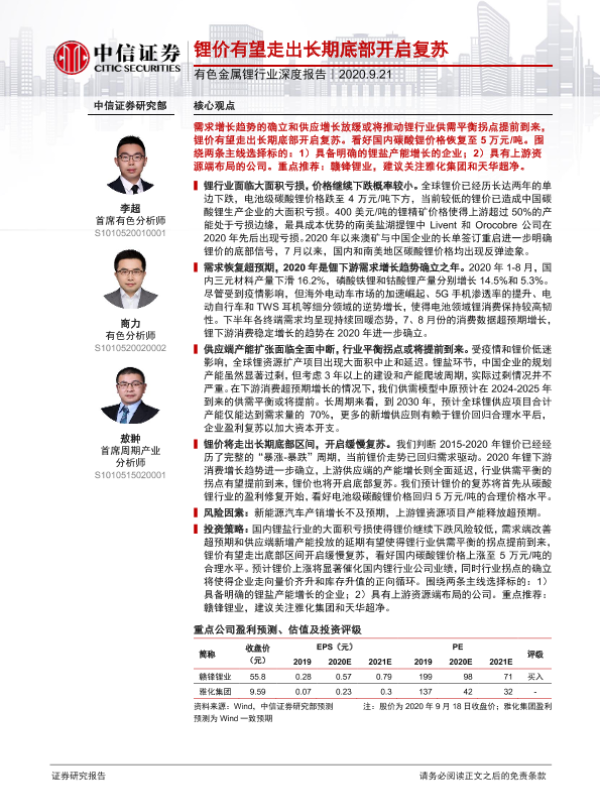【中信证券】【20200921】20200921-中信证券-有色金属锂行业深度报告:锂价有望走出长期底部开启复苏-22页