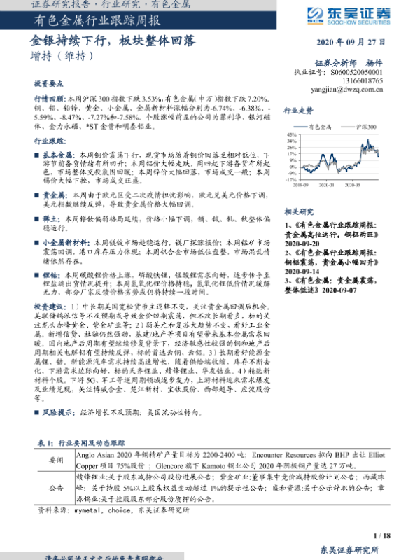 【东吴证券】【20200927】20200927-东吴证券-有色金属行业跟踪周报:金银持续下行,板块整体回落-18页