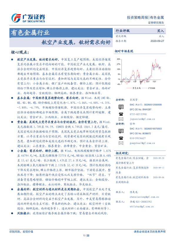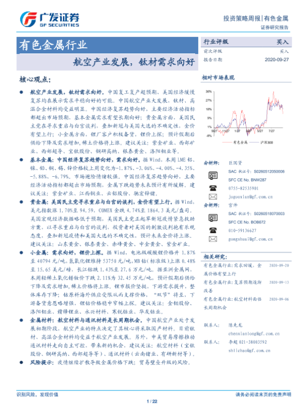 【广发证券】【20200927】20200927-广发证券-有色金属行业投资策略周报:航空产业发展,钛材需求向好-22页