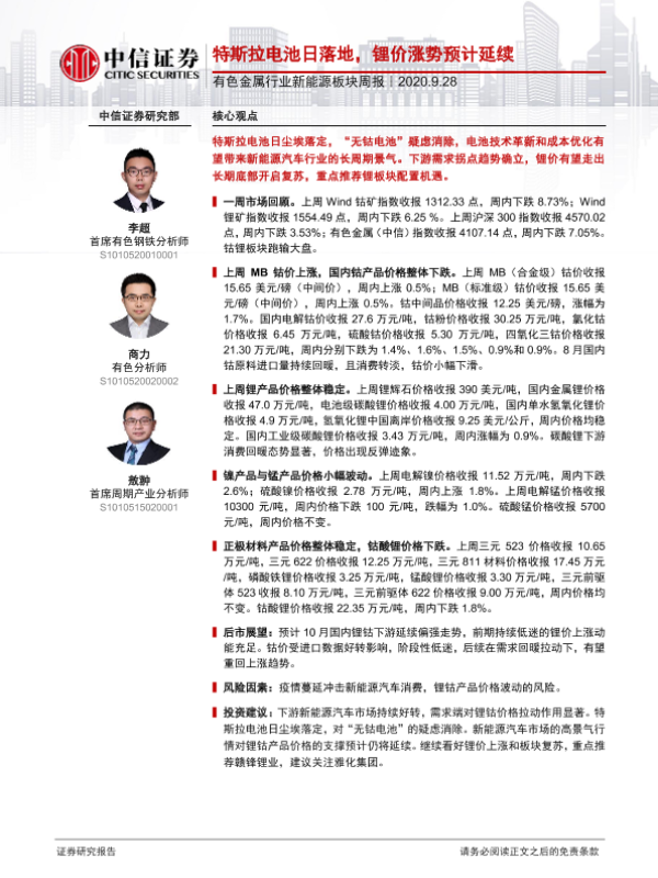 【中信证券】【20200928】20200928-中信证券-有色金属行业新能源板块周报:特斯拉电池日落地,锂价涨势预计延续-15页
