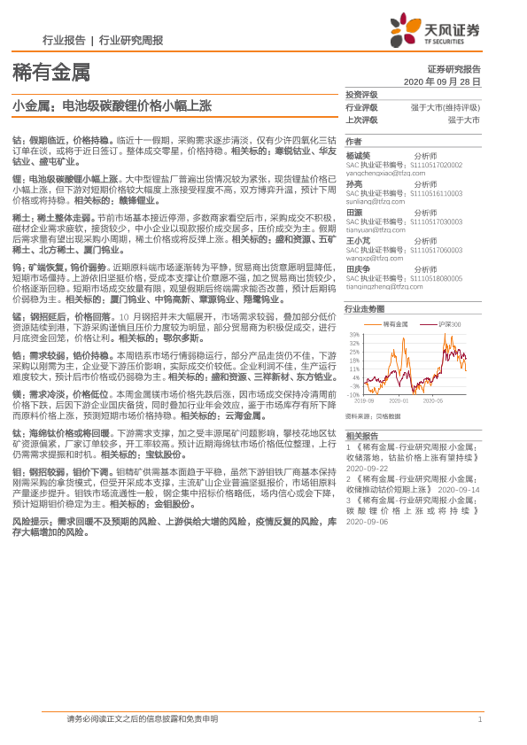 【天风证券】【20200928】20200928-天风证券-稀有金属行业研究周报:小金属:电池级碳酸锂价格小幅上涨-16页