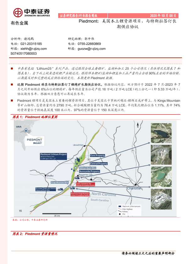 【中泰证券】【20201008】有色金属行业报告简版:Piedmont:美国本土锂资源项目,与特斯拉签订长期供应协议-6页