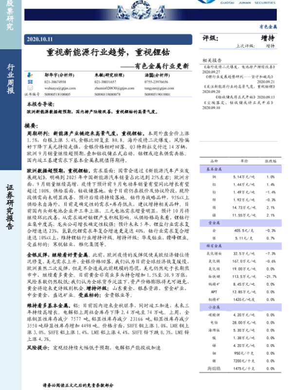 【国泰君安证券】【20201011】20201011-国泰君安-有色金属行业更新:重视新能源行业趋势,重视锂钴-12页