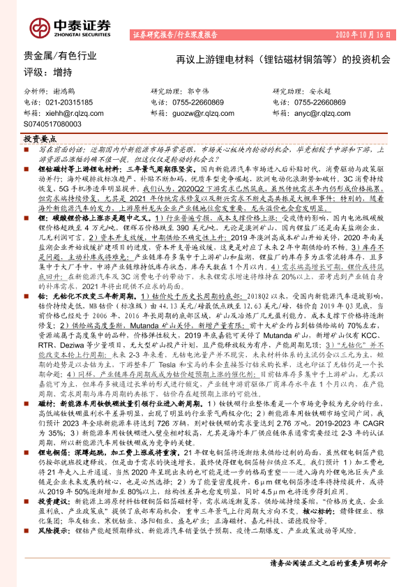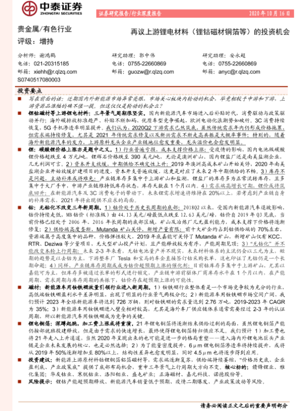 【中泰证券】【20201016】有色行业深度报告:再议上游锂电材料(锂钴磁材铜箔等)的投资机会-31页