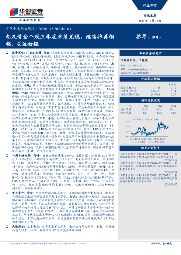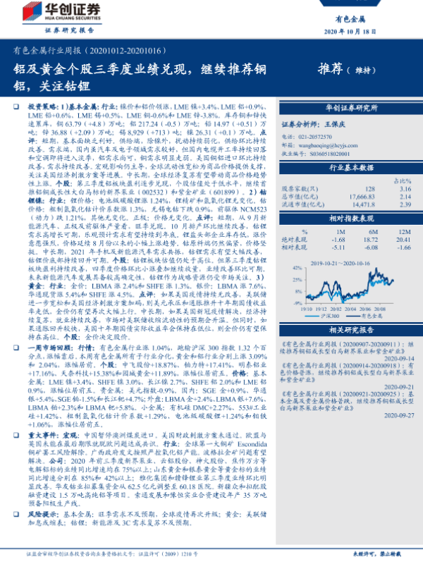 【华创证券】【20201018】20201018-华创证券-有色金属行业周报:铝及黄金个股三季度业绩兑现,继续推荐铜铝,关注钴锂-19页