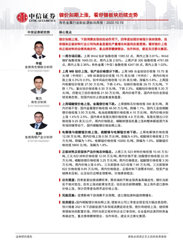 【中信证券】【20201019】20201019-中信证券-有色金属行业新能源板块周报:锂价如期上涨,看好锂板块后续走势-15页