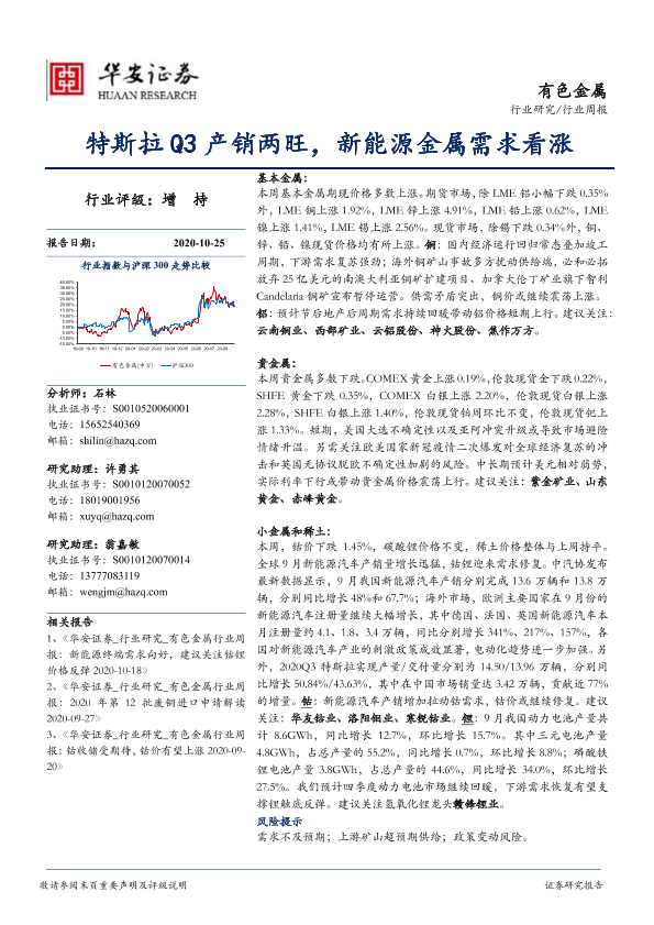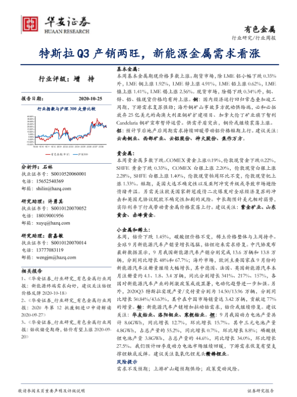 【华安证券】【20201025】20201025-华安证券-有色金属行业周报:特斯拉Q3产销两旺,新能源金属需求看涨-12页