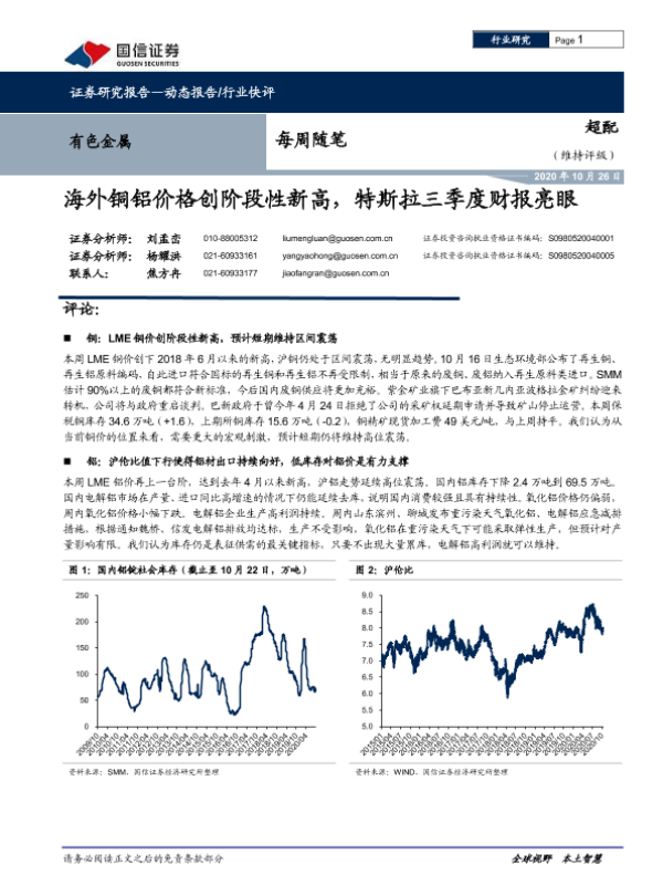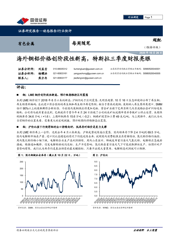 【国信证券】【20201026】有色金属每周随笔:海外铜铝价格创阶段性新高,特斯拉三季度财报亮眼-5页