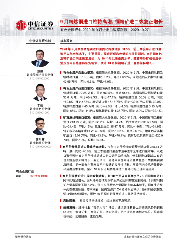 【中信证券】【20201027】有色金属行业2020年9月进出口数据跟踪:9月精炼铜进口维持高增,铜精矿进口恢复正增长-8页