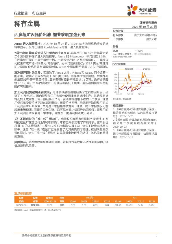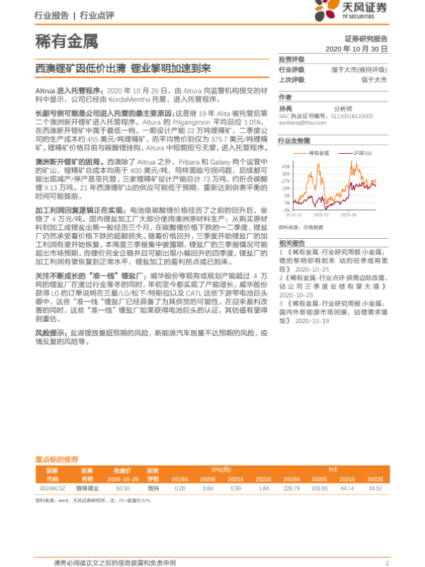 【天风证券】【20201030】稀有金属:西澳锂矿因低价出清 锂业黎明加速到来-2页