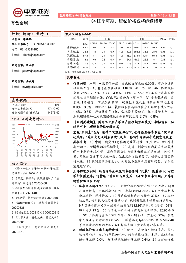 【中泰证券】【20201025】20201025-中泰证券-有色金属行业周报:Q4旺季可期,锂钴价格或将继续修复-44页