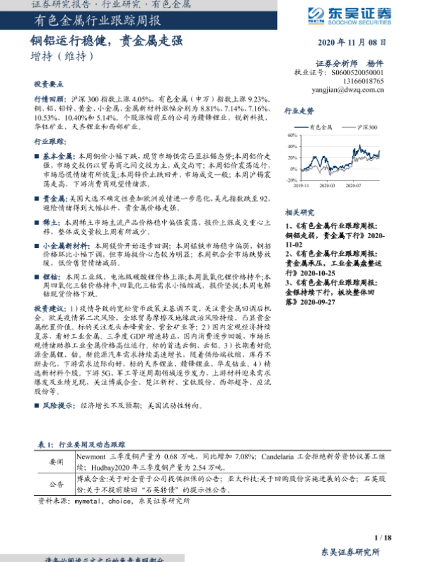 【东吴证券】【20201108】20201108-东吴证券-有色金属行业跟踪周报:铜铝运行稳健,贵金属走强-18页