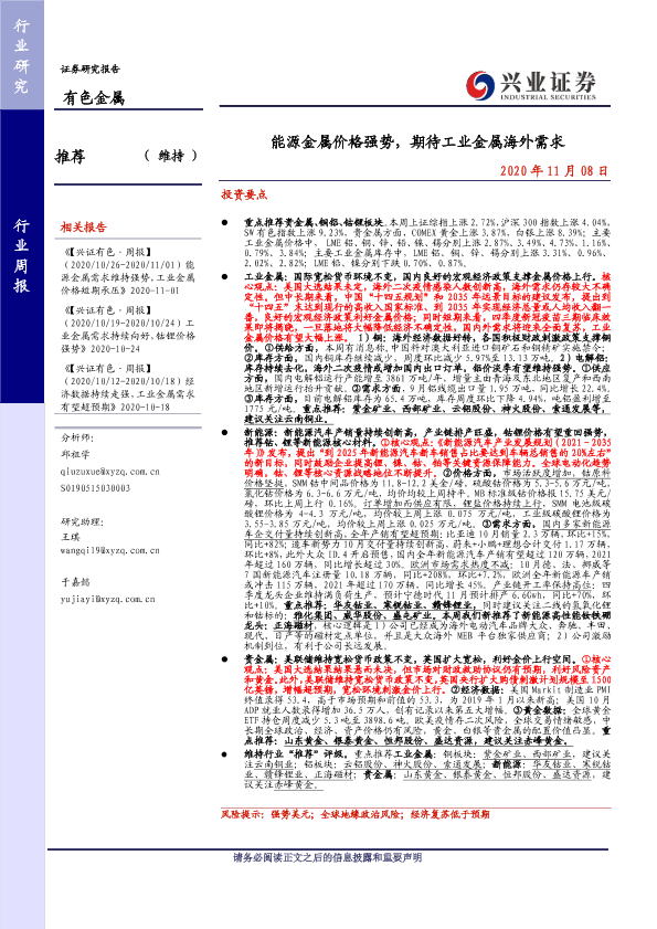 【兴业证券】【20201108】20201108-兴业证券-有色金属行业周报:能源金属价格强势,期待工业金属海外需求-22页