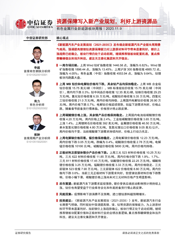 【中信证券】【20201109】20201109-中信证券-有色金属行业新能源板块周报:资源保障写入新产业规划,利好上游资源品-15页