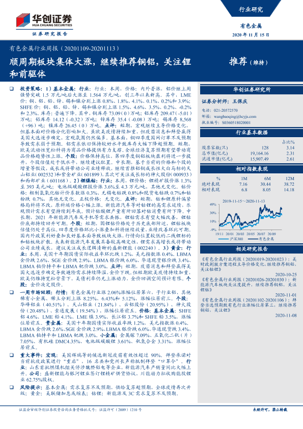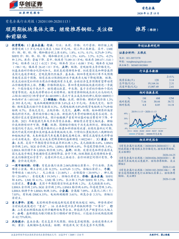 【华创证券】【20201115】20201115-华创证券-有色金属行业周报:顺周期板块集体大涨,继续推荐铜铝,关注锂和前驱体-19页